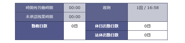 タイムカードの月ごとの集計では「勤務日数」、「休日出勤日数」、「法休出勤日数」、「特別休暇日数」が表示されます。