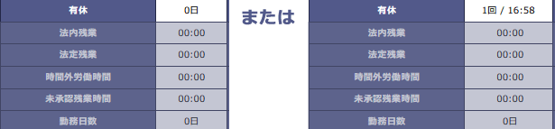 タイムカードの月ごとの集計では「勤務日数」、「休日出勤日数」、「法休出勤日数」、「特別休暇日数」が表示されます。